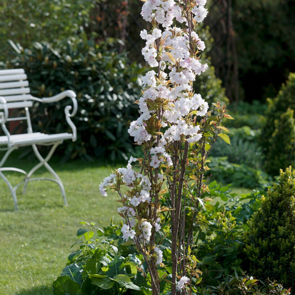 Ez az oszlopos növekedésű japán díszcseresznye tavasszal kifejezetten bőségesen virágzik. Halvány rózsaszín, félig telt virágai 3–4 cm-esek, enyhén illatosak, és április végén, május elején jelennek meg 3–5-ös kis csokrokban. Szinte teljesen beborítják az ágakat ilyenkor. A virágok színe idővel világosodik. A lomb tavasszal bronzszínű, nyáron zöld, ősszel narancsos-vörös színekben pompázik. Keskeny habitusa miatt kisebb kertekbe is jól beilleszthető, ráadásul jól tűri a városi körülményeket. Napos fekvést igényel.