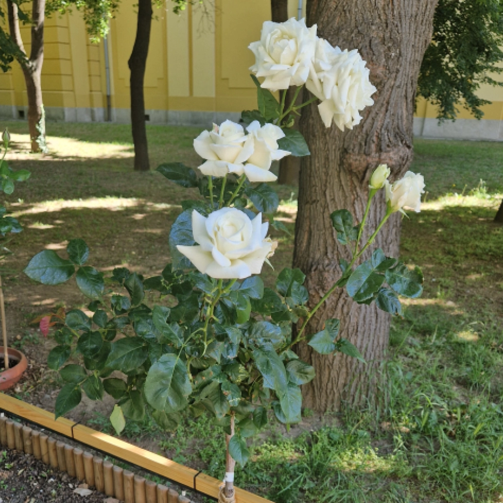 Ezt a rózsát elegancia és kifinomultság jellemzi. Nagy, enyhén illatos virágai bársonyos fehér szirmokból állnak. Virágzási ideje hosszú, tavasz végétól akár késő őszig is kihúzódhat. Mivel magastörzsre lett nevelve, szép és rendezett megjelenésű, és kisebb kertekben is elfér. A rózsa kifejezetten szereti a napos fekvést, és bőséges virágzással jutalmaz meg, ha napra ültetjük. Konténerben nevelt, 2 éves növényeket szállítunk.