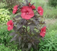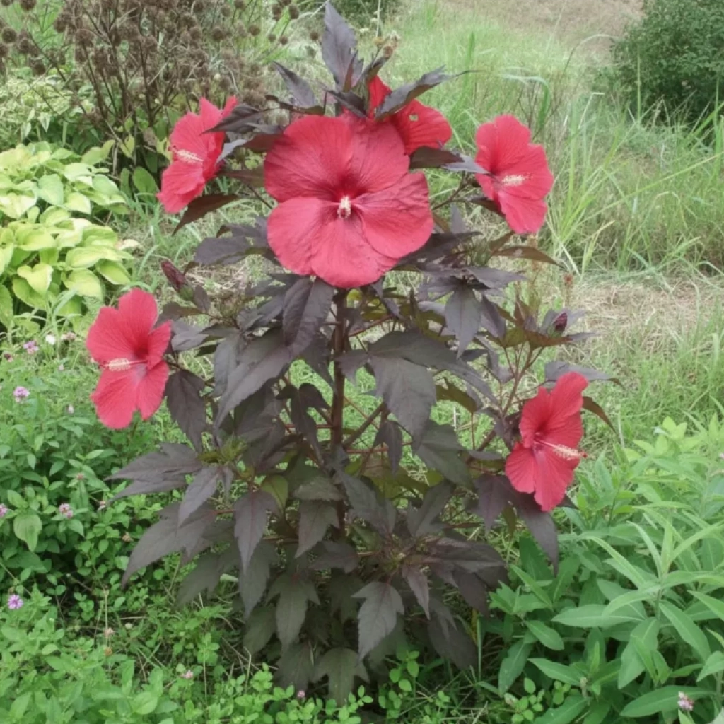 Ez a mocsári hibiszkusz feltűnően nagy, élénk vörös virágaival hívja fel magára a figyelmet. A virágok átmérője elérheti a 15–20 cm-t, és júliustól szeptemberig folyamatosan nyílnak. A növény sűrű, sötét árnyalatú lombját lilás-bíboros tónusok gazdagítják. Napos helyen, jó vízáteresztő talajban virágzik a legszebben.