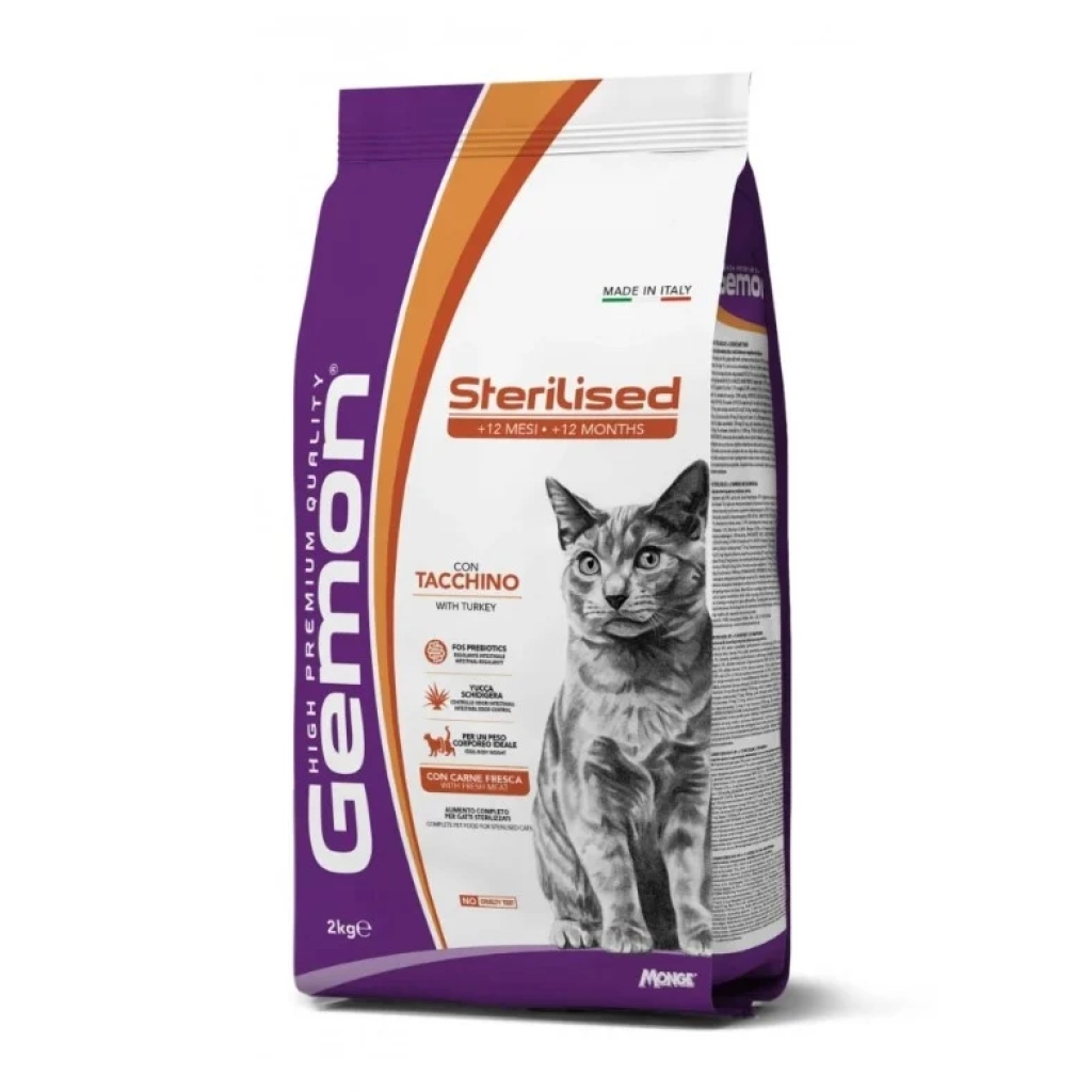 A Gemon Sterilised Cat teljes értékű tápanyagprofilt kínál, magas friss pulykahúst tartalmaz, amely kiváló minőségű fehérjeforrás. A receptúra prebiotikumokat is tartalmaz – F.O.S. és M.O.S. – amelyek támogatják az emésztőrendszer egészségét és segítenek fenntartani a kiegyensúlyozott bélflórát.