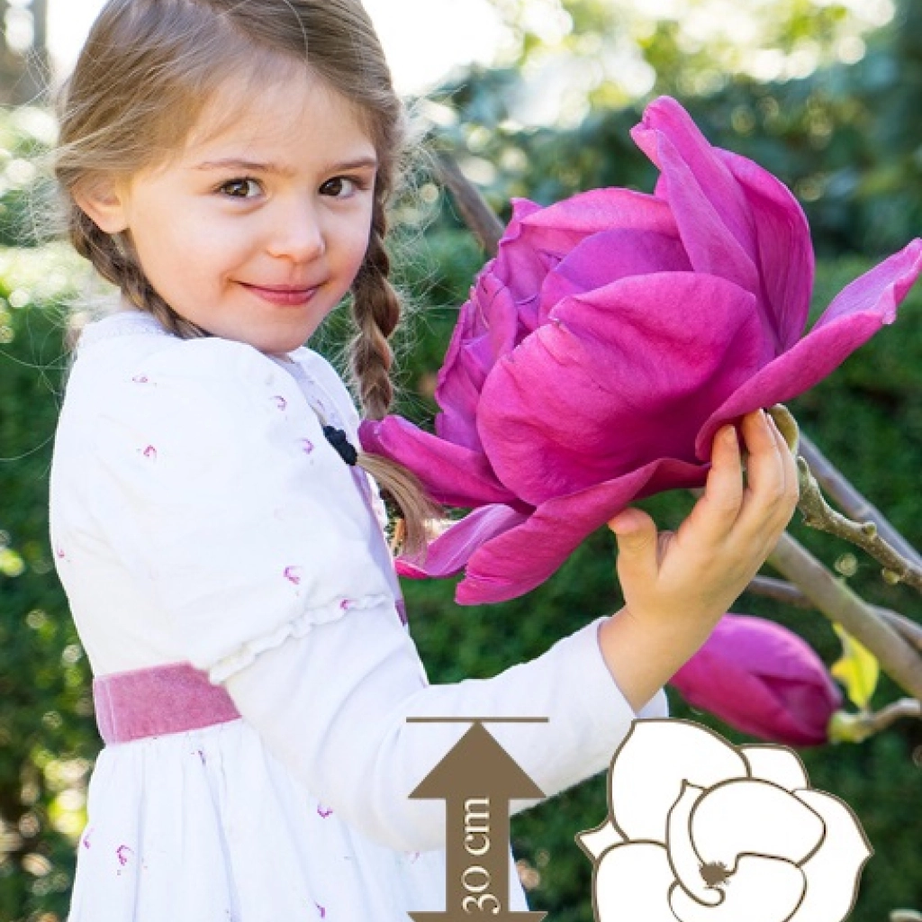 Gyönyörű magnólia impozáns,óriás virágokkal, melyek átmérője elérheti akár a 30 cm-t is. A virágzása rendkívül látványos, sötétrózsaszín szirmai már a lombfakadás előtt stílusosan díszítik a kertet. Lenyűgöző és elegáns megjelenésű fajta, ugyanakkor ellenálló és könnyen gondozható. A magnóliát jó vízelvezetésű és tápanyagban gazdag talajba, napos helyre ajánlott ültetni.