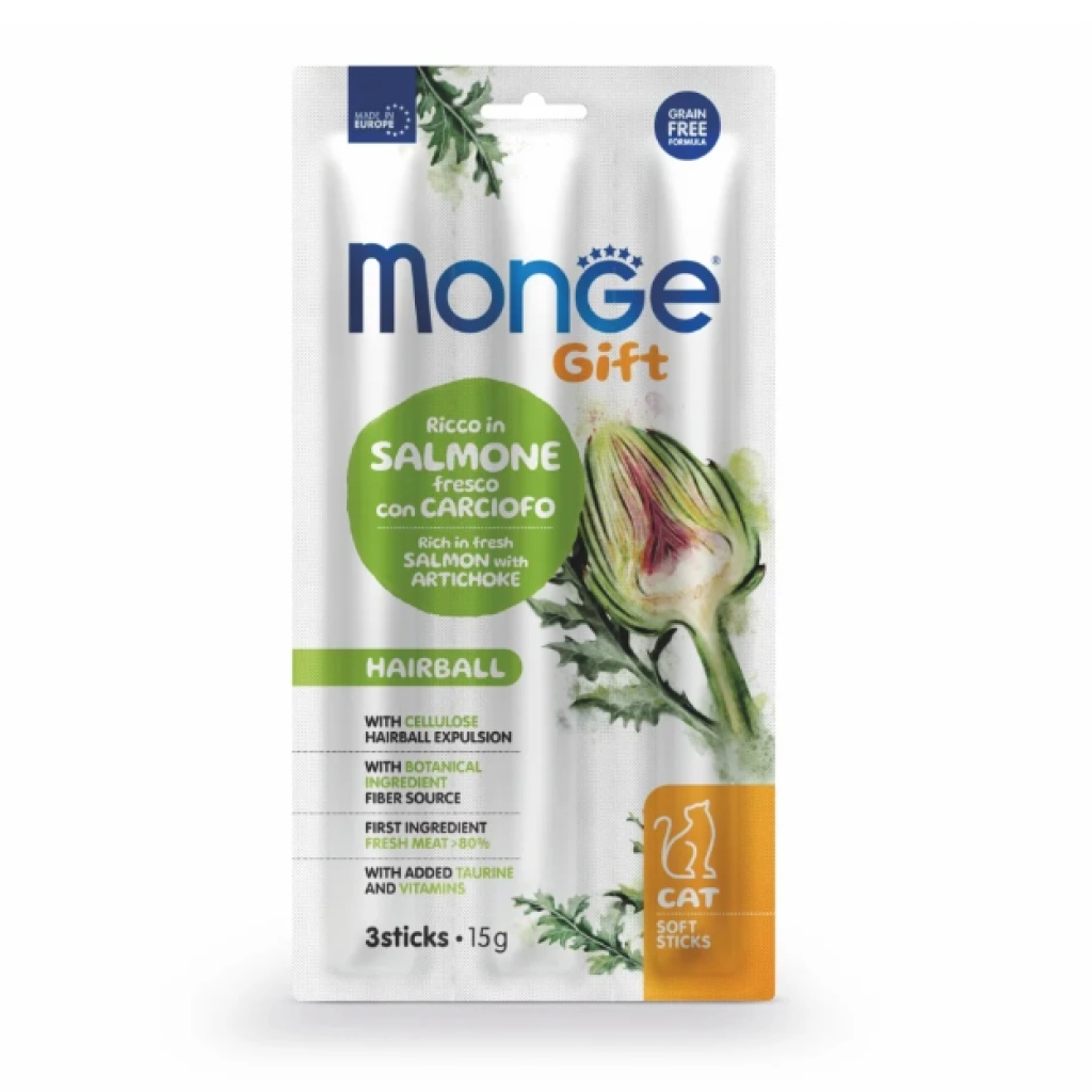 Monge Gift Sticks felnőtt macskáknak, jutalomfalat a szőrlabdák kialakulásának megelőzésére lazaccal és articsókával egy kiegészítő állateledel felnőtt macskák számára. Kifejezetten macskád jóllétének támogatására lett kifejlesztve, cellulózt tartalmaz a szőrlabdák fiziológiás eltávolításának elősegítésére, valamint csökkentett zsírtartalommal* rendelkezik az ideális testsúly fenntartásának támogatása érdekében. Gabonamentes receptúra, friss hússal, amely könnyen emészthető, magas biológiai értékű fehérjeforrás. A formula taurinnal van gazdagítva a normál látás és szívműködés támogatására, valamint vitaminokkal a mindennapi vitalitás érdekében. A növényi összetevők – például az articsókalevél, amely oldhatatlan rostok forrása a bélrendszer megfelelő működéséhez – hozzáadása az olasz (Made in Italy) kutatás eredménye, amely macskáink életminőségének javítását szolgálja. Nem tartalmaz mesterséges színezékeket és hozzáadott cukrot.