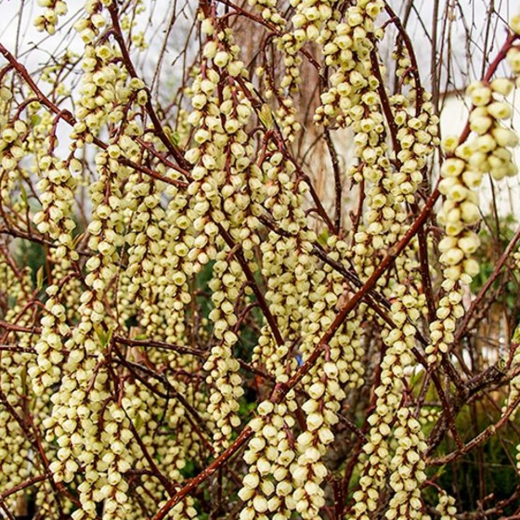 Mutatós és különleges díszcserje, amely már a tavasz legelején csodásan díszíti a kertet. Virágzása lenyűgöző. Virágai hosszú fürtökben nőnek, és gyöngyökként lógnak a még csupasz ágakról. A virágok színe általában halványsárga vagy zöldessárga. A fiatal ágak vörösesbarna árnyalatúak, ami nagyon esztétikus kontrasztot ad a virágokkal. A levelek a virágzás után jelennek meg. Nyáron a lombozat kellemes zöld, az ősz beköszöntével pedig meleg árnyalatokat ölt. A zászlócserjét jó vízelvezetésű talajba, napos vagy félárnyékos helyre ajánlott ültetni. A bőséges napsütés gazdag és látványos virágzáshoz vezet.