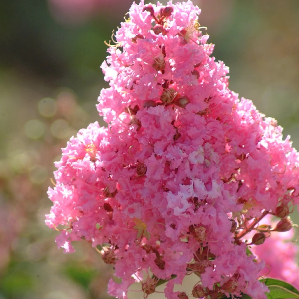 Csodaszép selyemmirtusz, amely a nyár derekátől őszig virágzik. A nagy bugákba csoportosuló rózsaszín virágok gyönyörű kontrasztot alkotnak a zöld lombozattal. A virágok érdekes, kreppelt textúrájúnak hatnak. Ősszel a levelek narancssárga és vörös árnyalatokat öltenek. A kifejlett növény kérge is nagyon dekoratív, érdekesen texturált és hámló. A bőséges virágzás érdekében napos helyre ajánlott ültetni.
