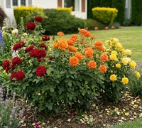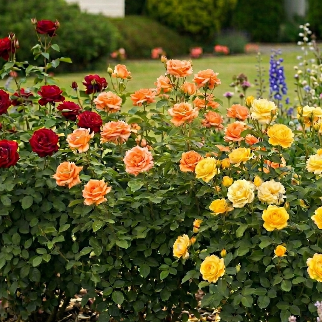 A Színpompás Trio három teahibrid rózsafajtát hoz össze egy csomagban, amelyek színei szépen kiegészítik egymást. A sárga virágú Sunblest, a narancsos színű Doris Tysterman és az élénkpiros Dame de Coeur együtt meleg, élő összhatást ad a kertben. Mindhárom fajta erős növekedésű, nagy virágú, és jól illeszkedik egymáshoz. Májustól az első őszi fagyokig pompásan virágoznak. A rózsákat jó vízelvezetésű talajba és kifejezetten napos helyre ajánlott ültetni.