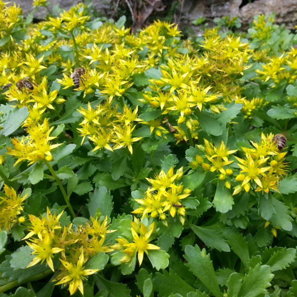 Ez a varjúháj az egyik legdekoratívabb talajtakaró növény. Pozsgás, szürkészöld lombozata sűrű, egyenletes, mindössze 8-10 cm magas növényszőnyeget alkot. Júniusban és júliusban aranysárga virágok borítják a növényt, amelyek vonzzák a méheket és a pillangókat. A virágok után narancssárga magtokok maradnak, amelyek nem hivalkodó, érdekes díszítőelemként szolgálnak. Ősszel a lombozat vöröses árnyalatokat ölt. A növény télálló és szárazságtűrő. Szegény talajon is könnyedén nevelhető, mivel a napsütötte kertek egyik legkevésbé igényes növénye. Remekül mutat sziklakertekben, térkövek mentén vagy akár cserépben a teraszon.