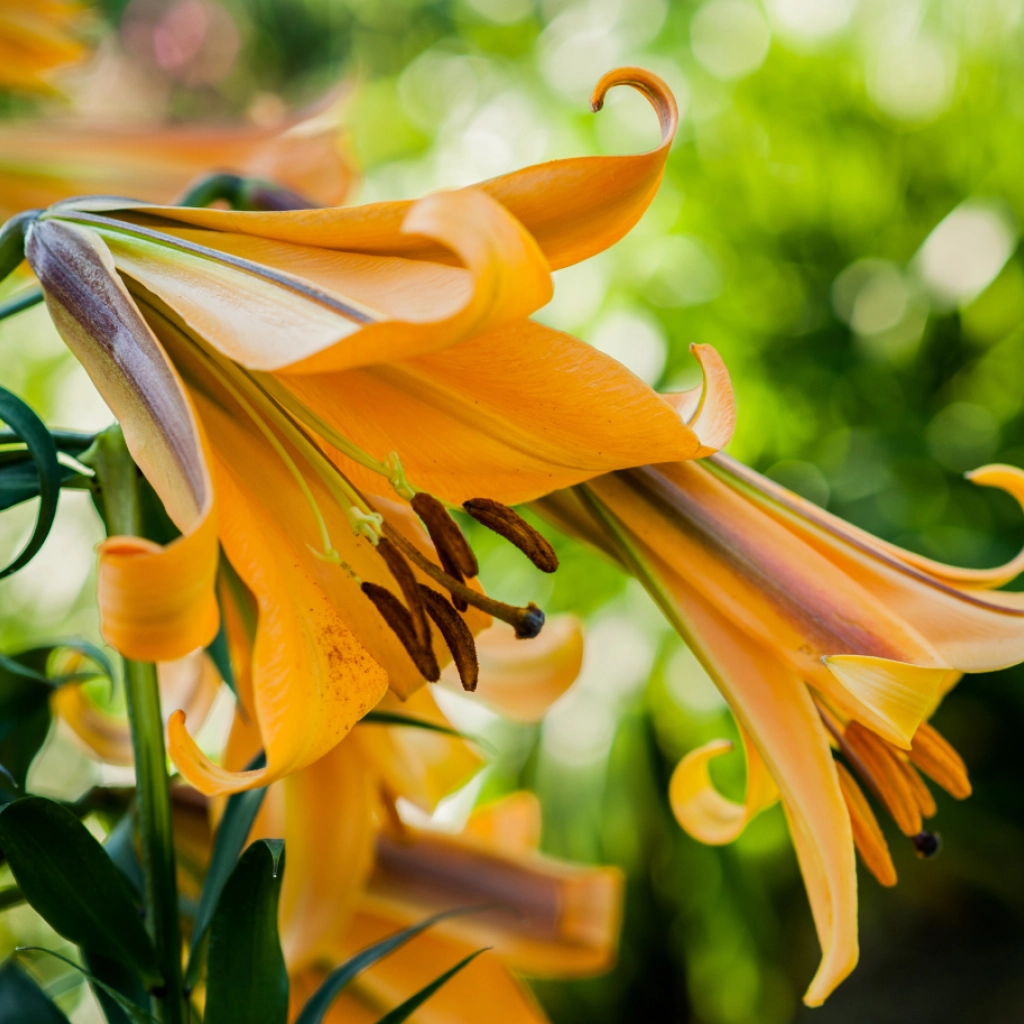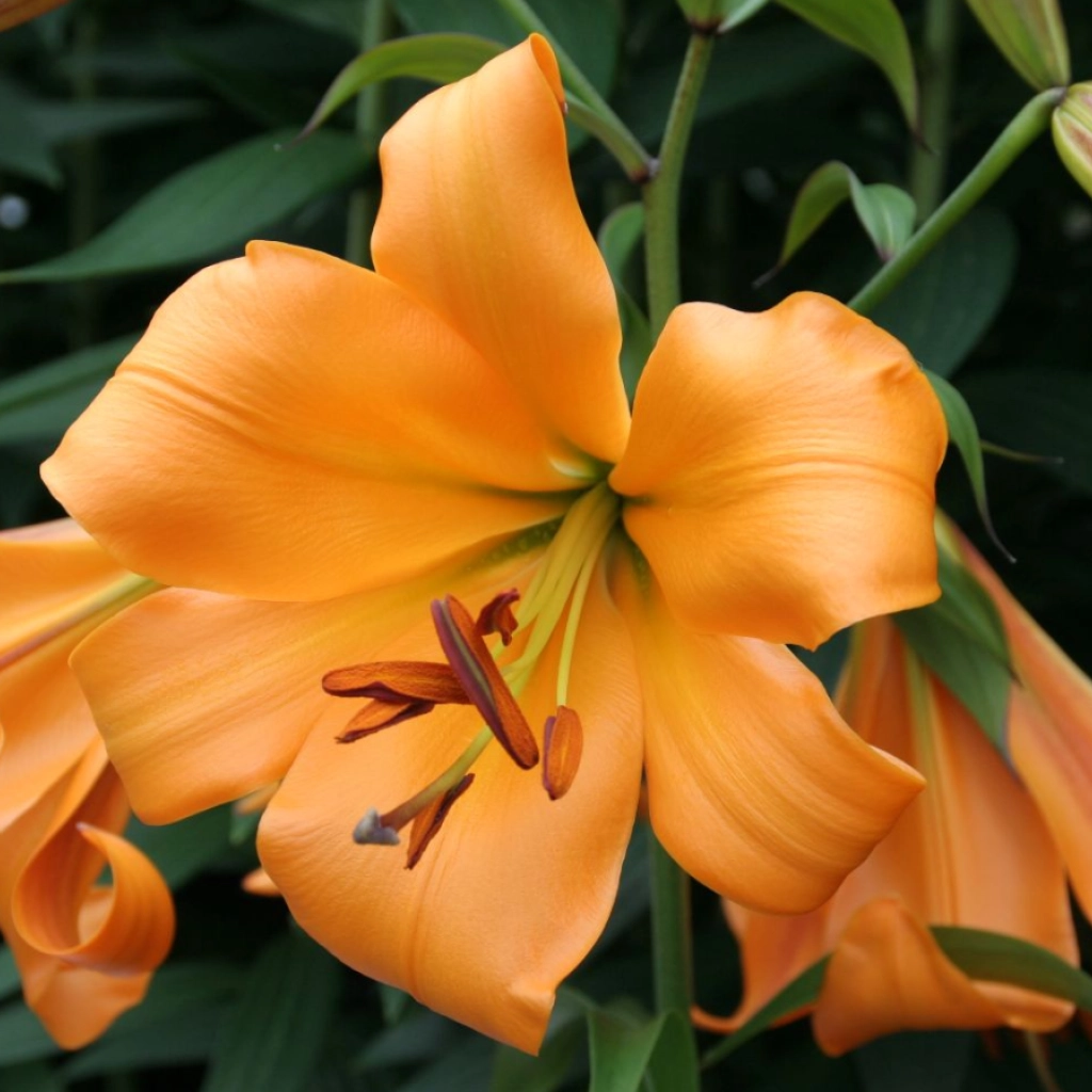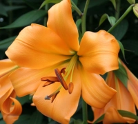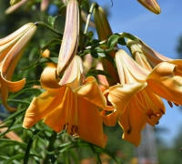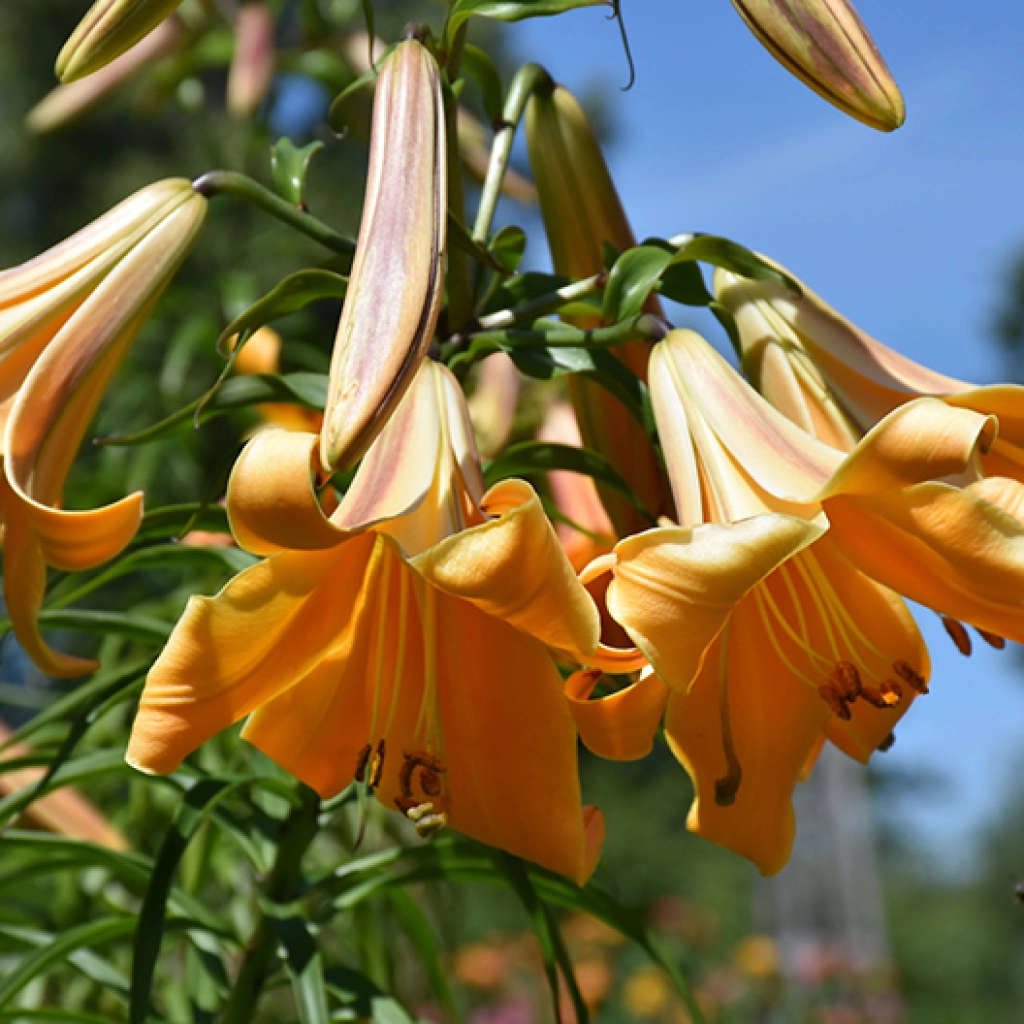 Narancssárga liliomhibrid, óriási, trombita alakú virágokkal. Télálló. A