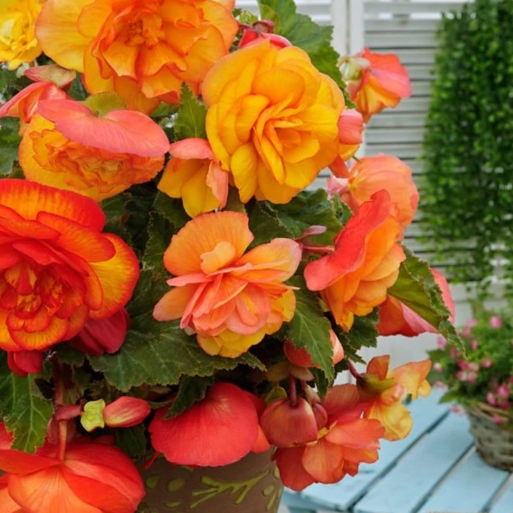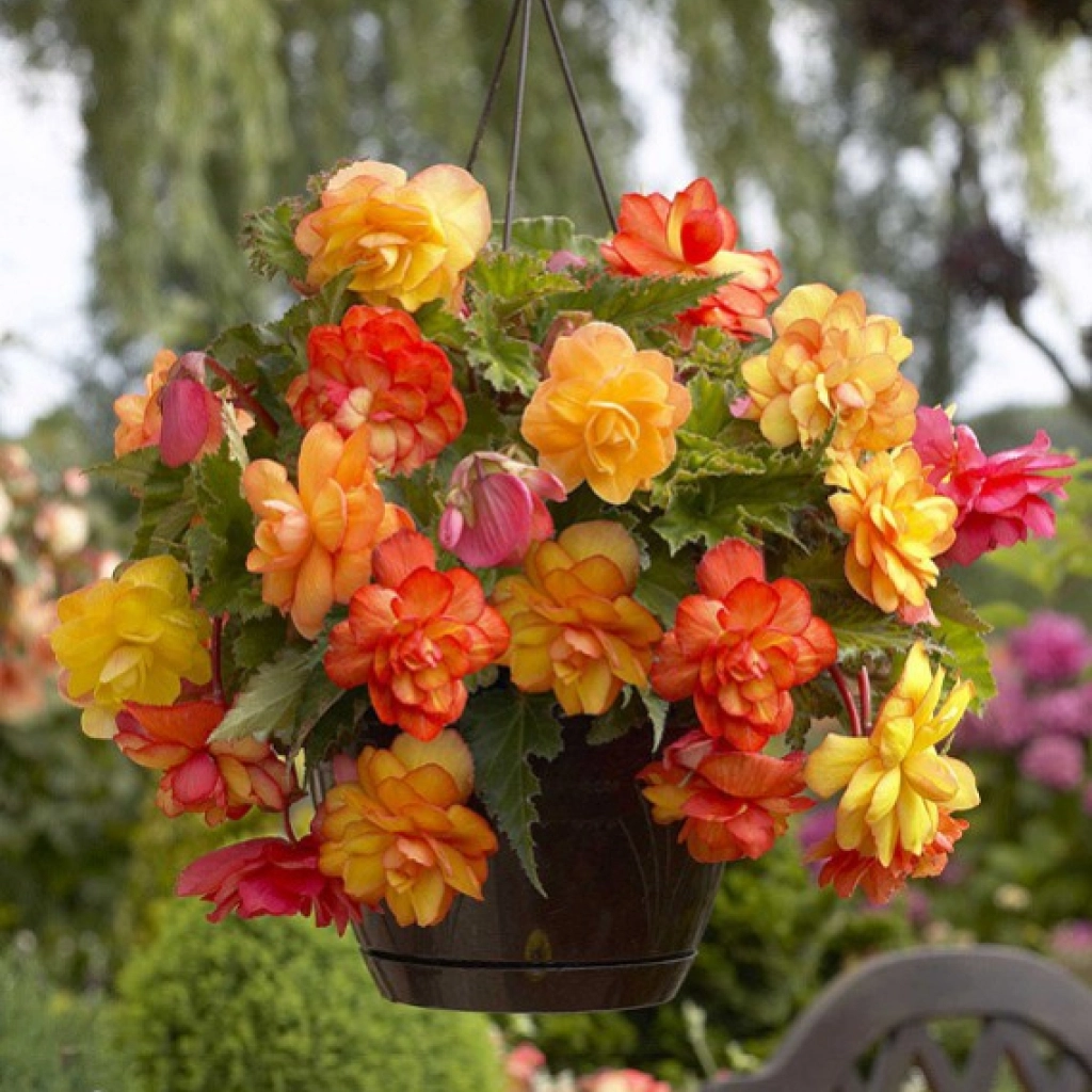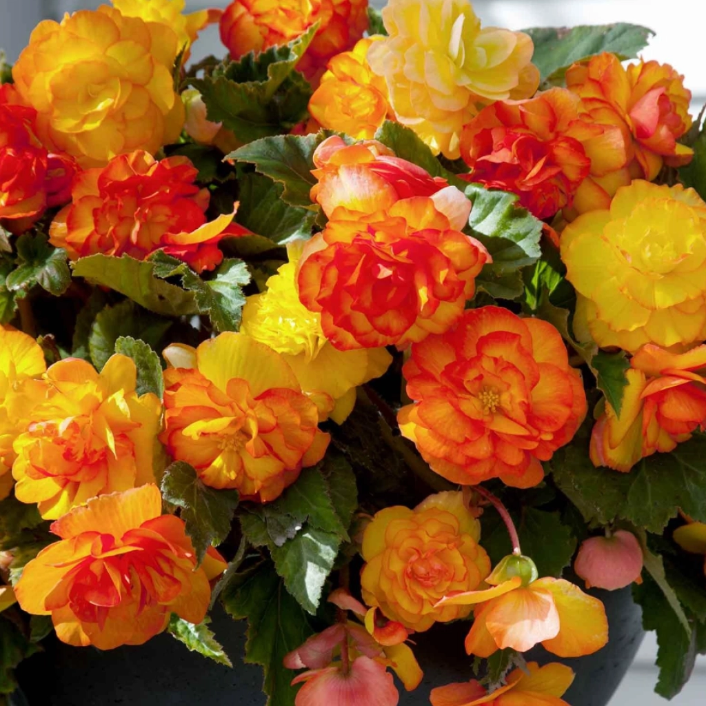 Újonnan nemesített fajta, rendkívül bőséges virágzással. Telt virágai a tűz élénk színeiben tündökölnek. Szirmai élénksárgából narancsszínre váltanak. Igen látványosak függőcserépbe, balkonládába ültetve. A csomag 2 darab gumót tartalmaz.