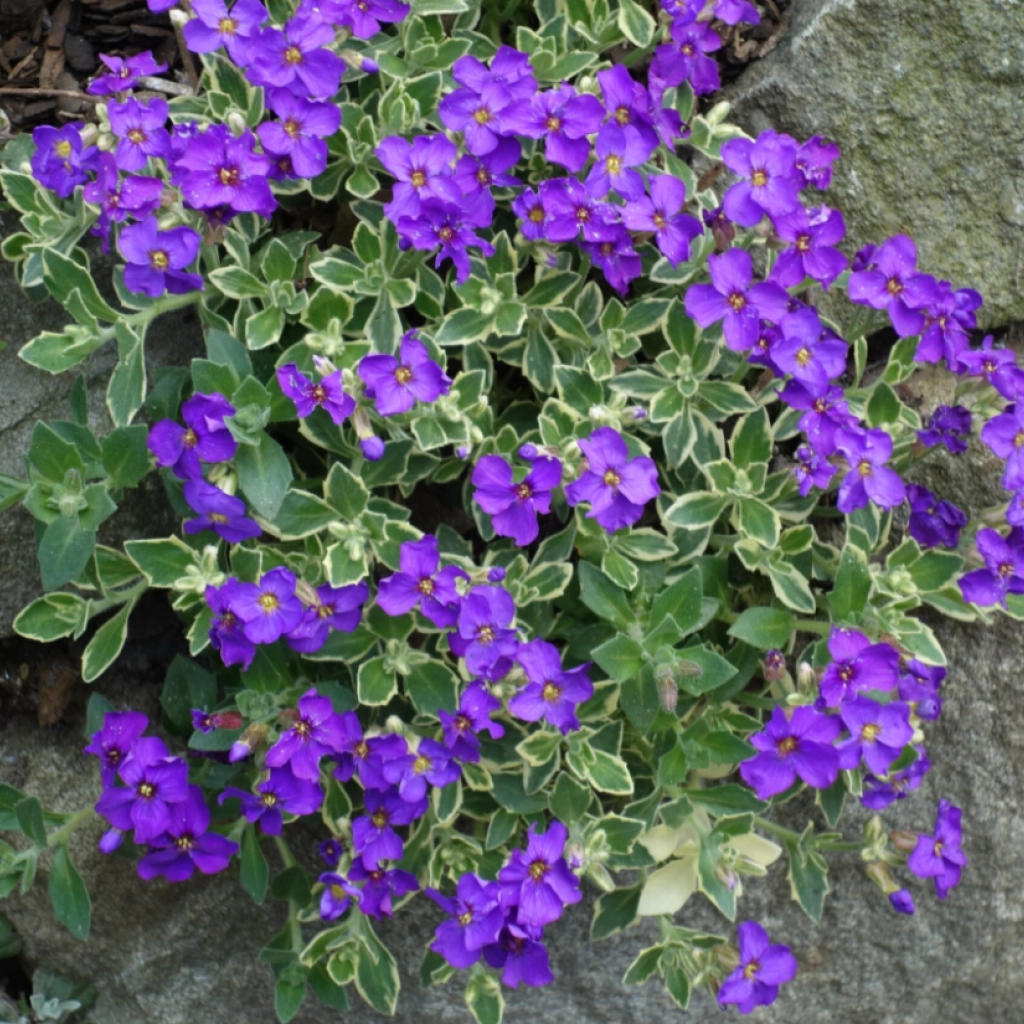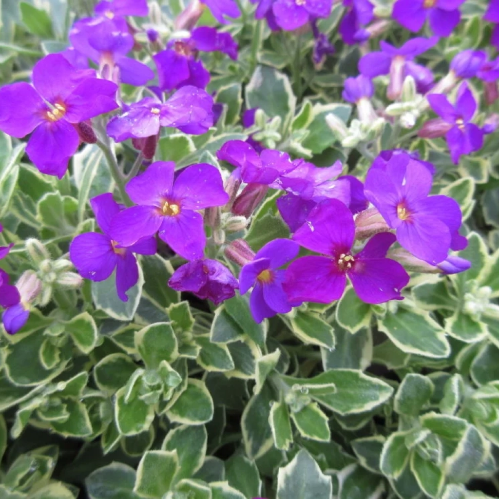 Alacsony növésű évelő, mely remekül használható talajtakarásra a kert naposabb és szárazabb részeiben. Gazdagon virágzik a tavasz közepétől. Élénklila, négyszirmú virágai szinte teljesen ellepik ilyenkor a növényt. Apró, szürkészöld leveleit krémszínű szegély teszi különlegessé. Örökzöld növény, így egész évben díszít. Napos helyet és jó vízáteresztő talajt igényel. Gyengébb, enyhén lúgos talajokon is szépen fejlődik.