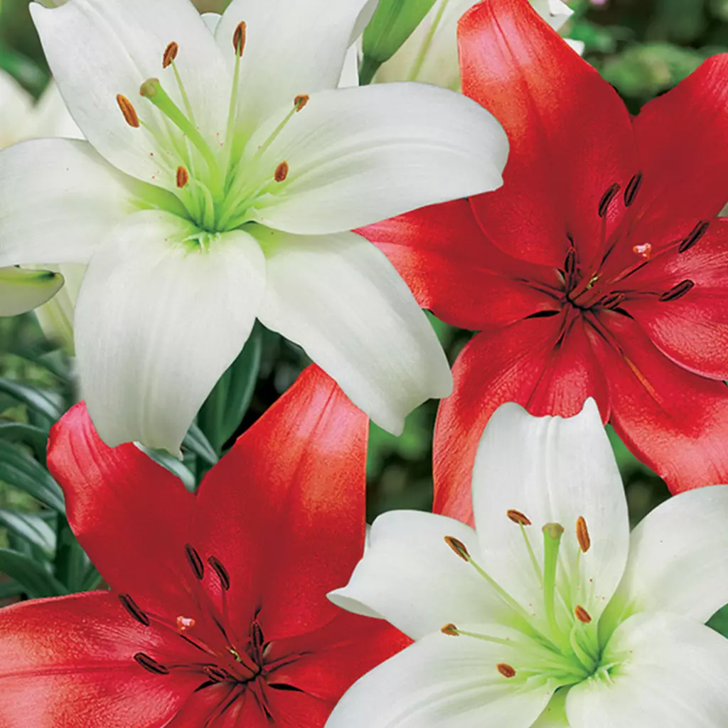 Ideális párost alkot a két liliom, amely bármely kültéri területet tökéletesen dekorál. A nagy, fehér és piros színű virágok lenyűgöző színkontrasztot alkotnak. Akár 0,8-1 m magasságot is elérhet, ezért kitűnő hátteret biztosít alacsonyabb növekedésű növények számára. Kertünk világos, napos részére ültessük! A virághagyma télálló.