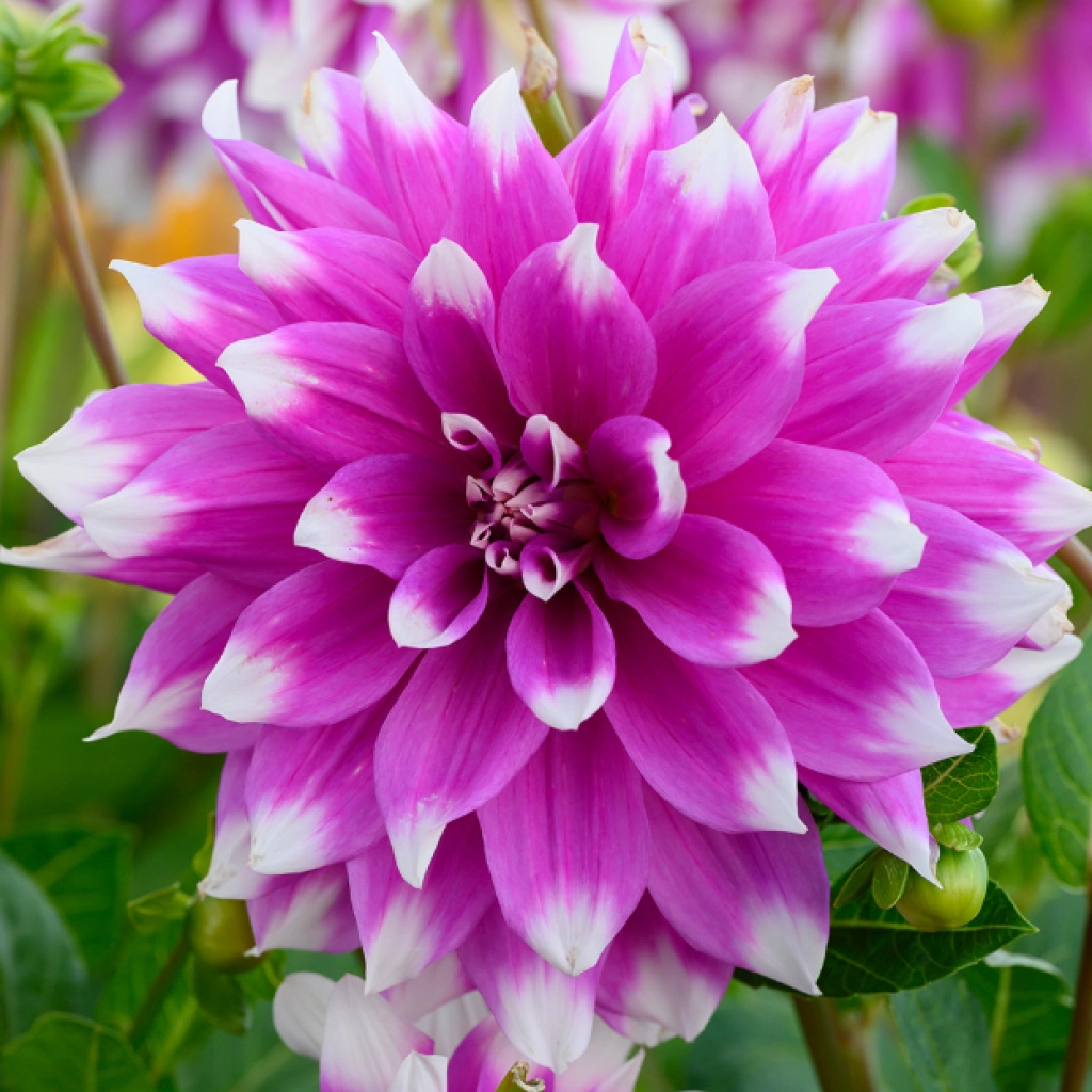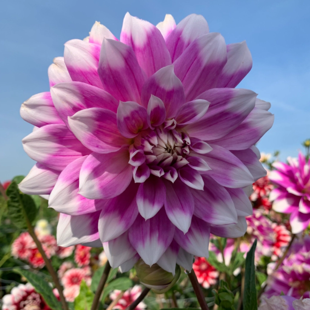 Ez a dália nagyméretű és látványos virágokkal büszkélkedhet. Virágainak átmérője általában 15-20 cm, de előfordulaht, hogy a 20 cm-t is meghaladják. A szirmok alapszíne lila, a hegyeik pedig fehérek, ami elegáns kontrasztot teremt. A dália a nyár közepétől az első őszi fagyokig virágzik. Napos helyre, jó vízelvezetésű talajba ajánlott ültetni. A csomag 1 dália gumót tartalmaz.
