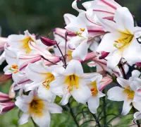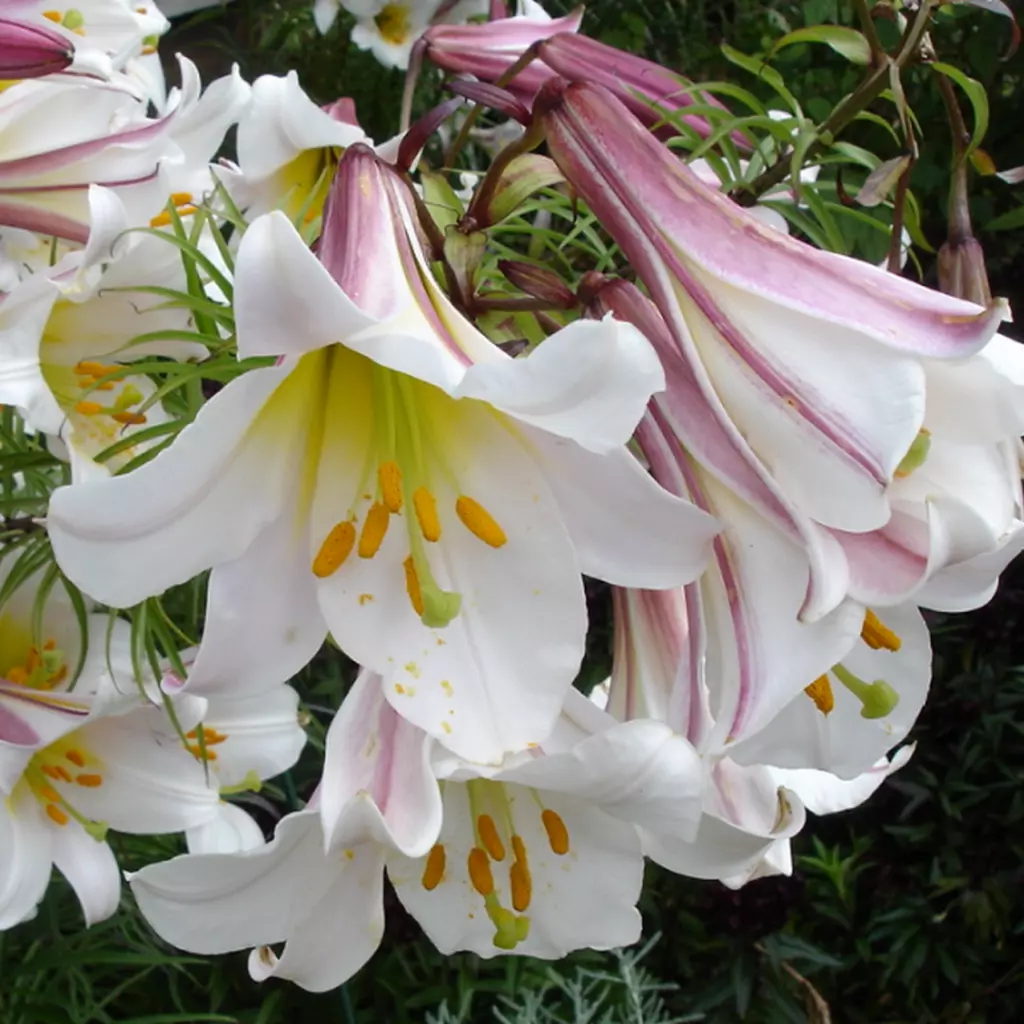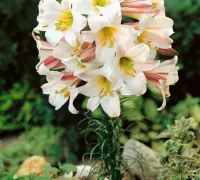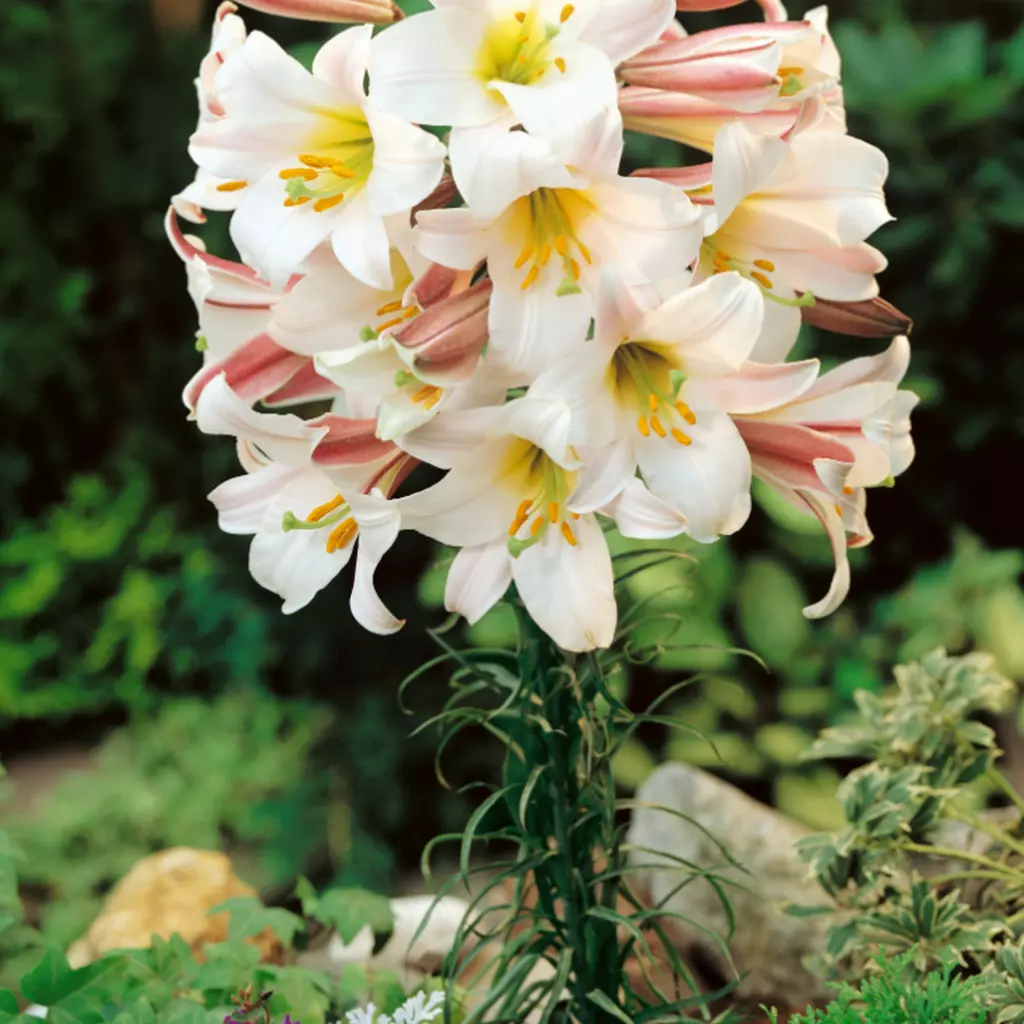 Kétségtelenül a királyliliom az egyik legkedveltebb és legismertebb a liliomok közül. Nagy méretű virágának közepe sárga, szirmainak belső része fehér, külső oldalát pedig rózsaszínes-bordó csíkok díszítik. Virágzáskor édes illattal árasztja el kertünket. Vágott virágaiból mesés csokrokat készíthetünk. A csomag egy darab hagymát tartalmaz.