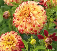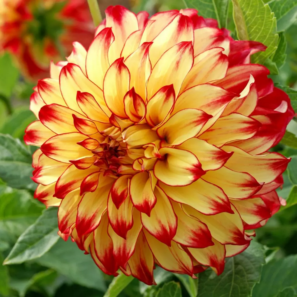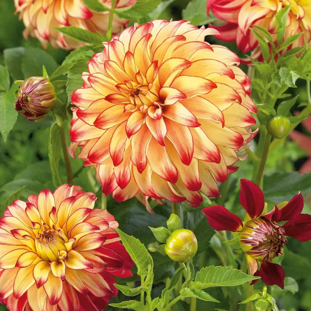 Fantasztikus színekben pompázó virágok, amelyek tündöklő fényforrásként hatnak a kertben. Az aranysárga szirmok széle sötétvörössel díszített. Nyár elejétől egészen a fagyokig töretlenül virágzik. A csomag 1 gumót tartalmaz.