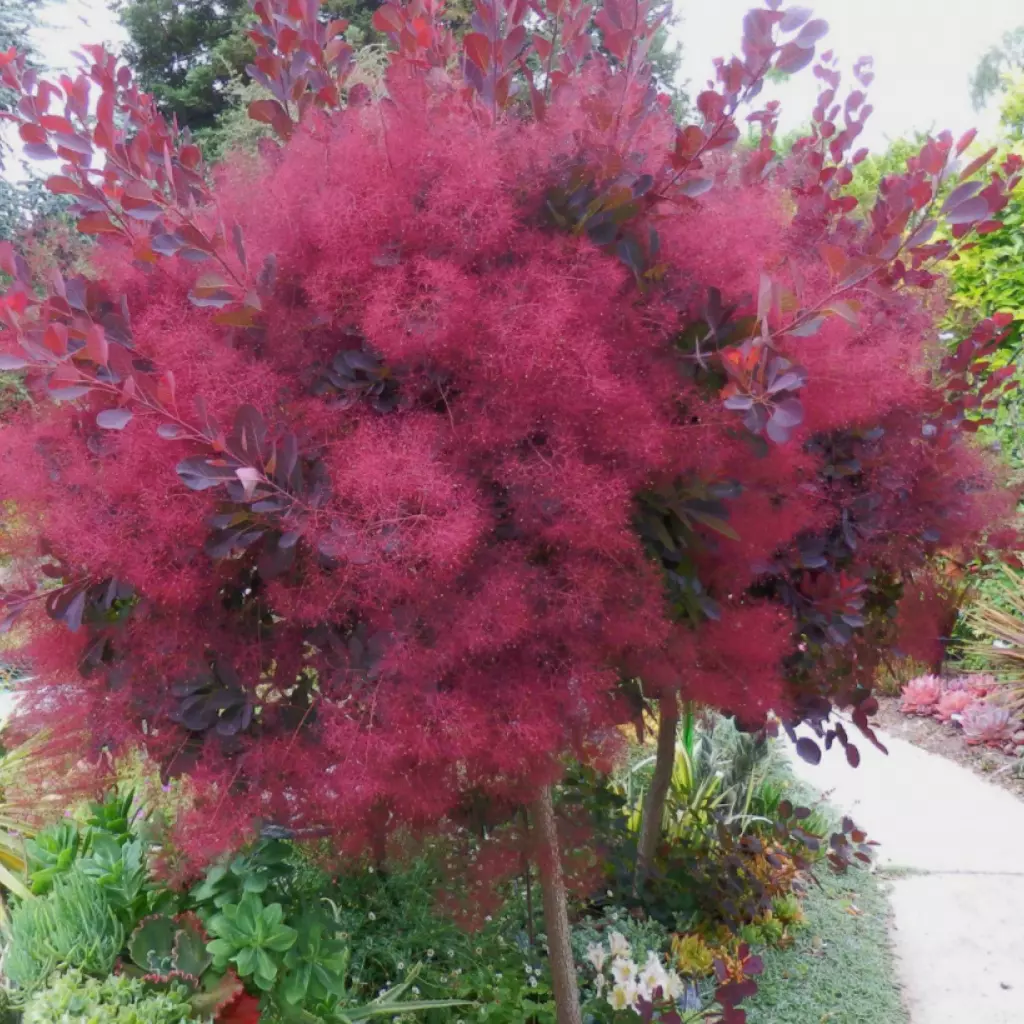 Káprázatos színével hívja fel magára a figyelmet. Az apró, sárga virágok nyár elején nyílnak, szép kontrasztot alkotva a sötétpiros színű lombbal. A lilásrózsaszínbe átváltó vattacukorszerű bugavirágzat igen látványos. Remekül mutat szoliterként, és csodásan érvényesül az alacsony növények közé ültetve is. Napos vagy félárnyékos helyre ajánlott ültetni.