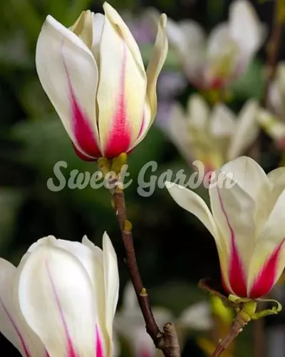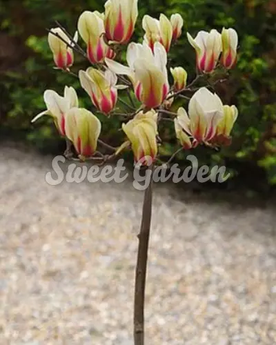 Magas törzsre oltott népszerű magnólia fajta! A zöld színű bimbók fehéressárga virágokká fejlődnek ki, melyeket piros színű láng díszít. Kellemes illatot áraszt! Szép, fejlett, konténeres növényeket küldünk.