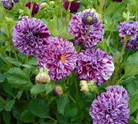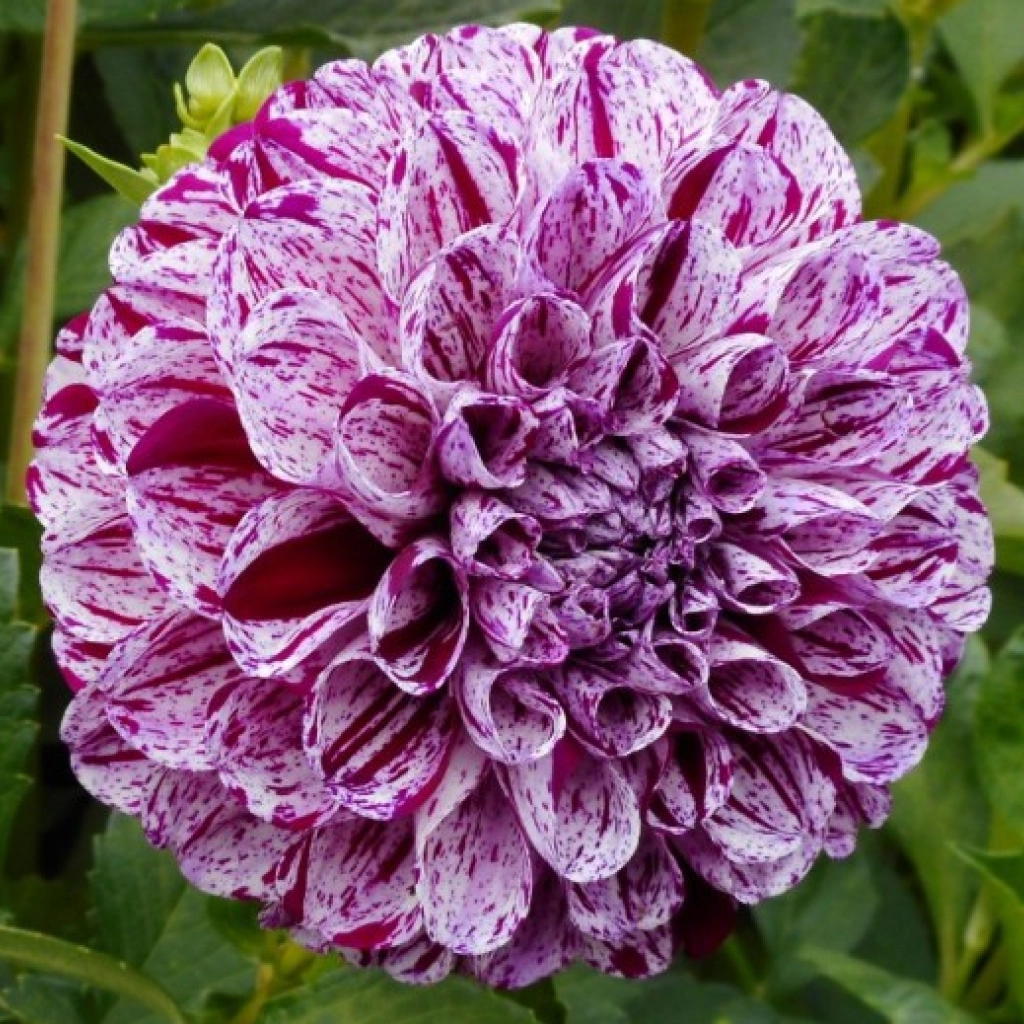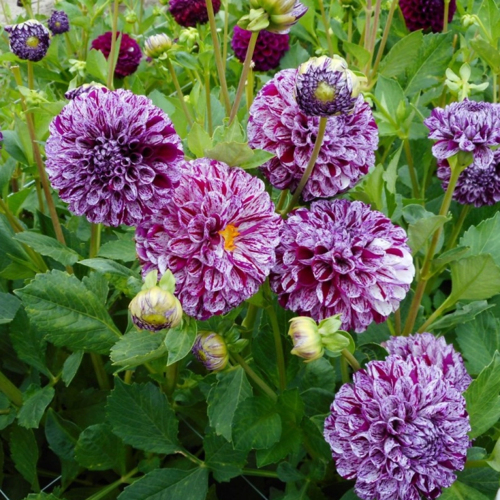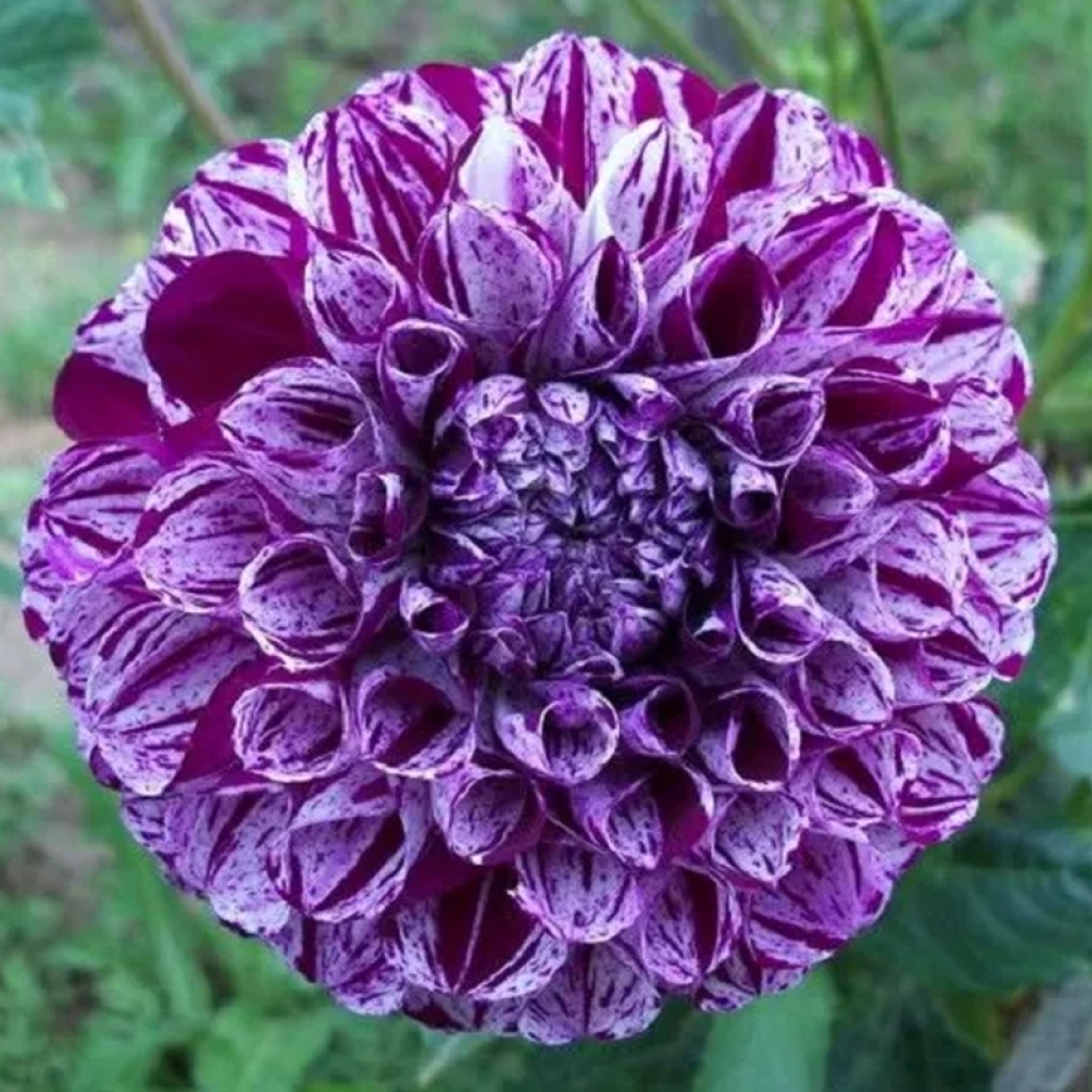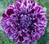 Egyedi mintázatú labda dália. A bíboros alapon változó arányban lilásrózsaszín csíkok helyezkednek el. A kerekített végű szirmok hatalmas virágfejeket alkotnak. A csomagban 1 rizóm található.