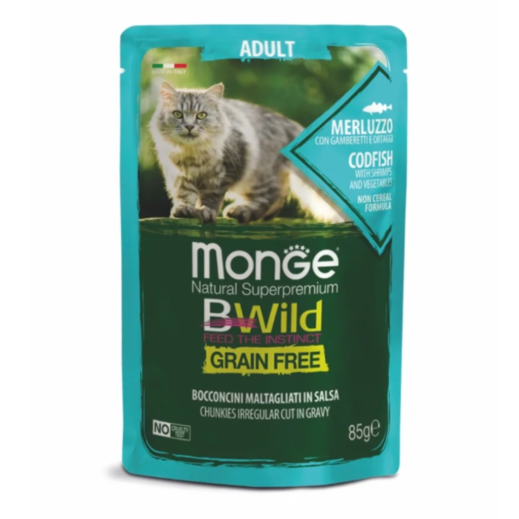 Monge BWild nedves eledel felnőtt macskáknak, tőkehal, garnéla és zöldségek egy teljes értékű és kiegyensúlyozott eledel felnőtt macskák számára. A macskák jóllétét szem előtt tartva lett kifejlesztve, alternatív, gabonából nem származó szénhidrátforrások – például zöldbab és sárgarépa – valamint garnéla felhasználásával, amely magas biológiai értékű fehérjeforrás. A receptet új generációs prebiotikumokkal, xilo-oligoszacharidokkal (XOS) gazdagították a bélrendszer egészségének támogatása érdekében. Yucca schidigera kivonatot tartalmaz a széklet szagának csökkentésére.