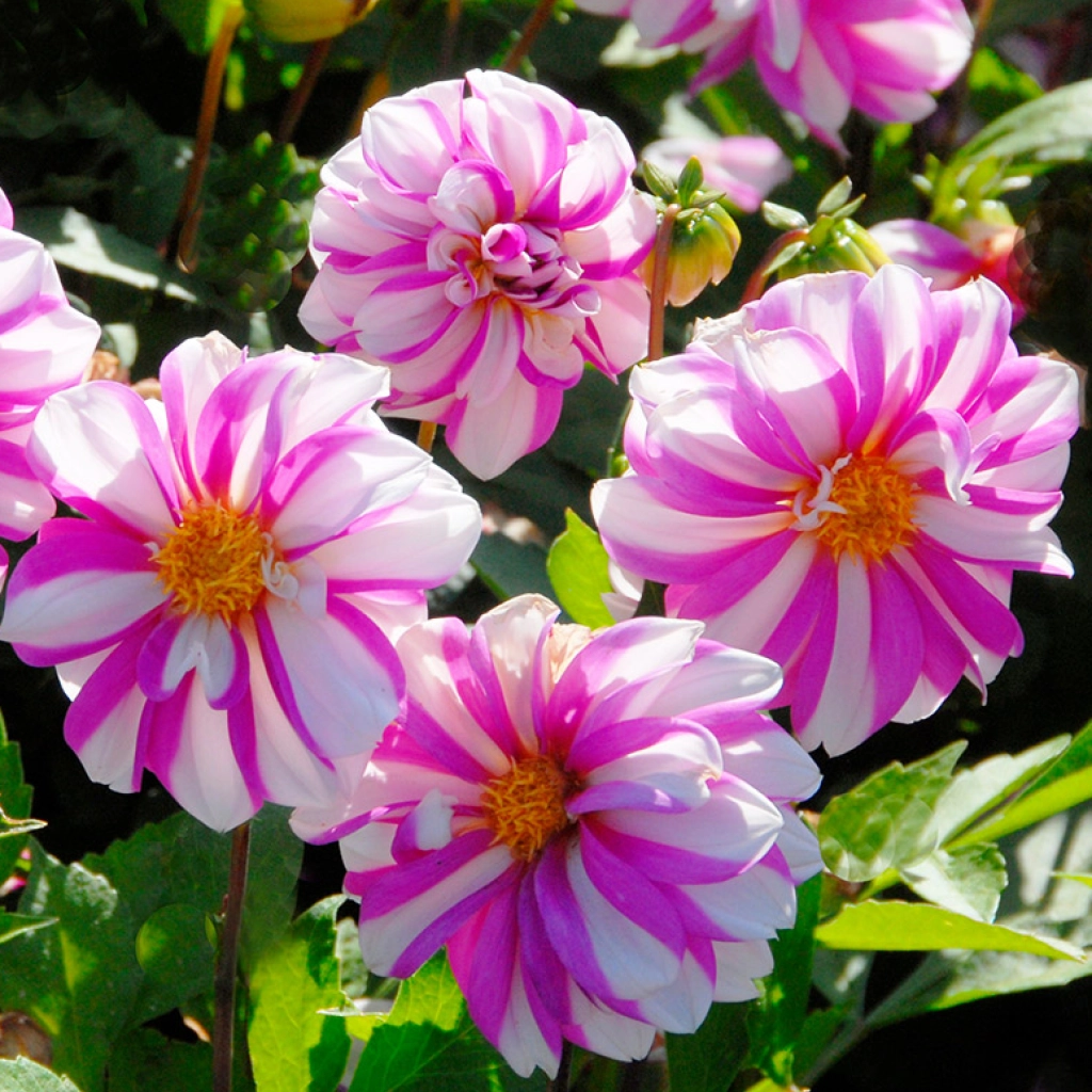 Vidám, fiatalos hangulatot keltő dália. Szirmainak közepe fehér vagy halványrózsaszín, szélük pedig élénk lilásrózsaszín, ami azt a hatást kelti, mintha a virágok csíkosak lennének. A nyár derekától az első őszi fagyokig virágzik. Napos helyre, jó vízelvezetésű talajba ajánlott ültetni. A csomag 1 dália gumót tartalmaz.