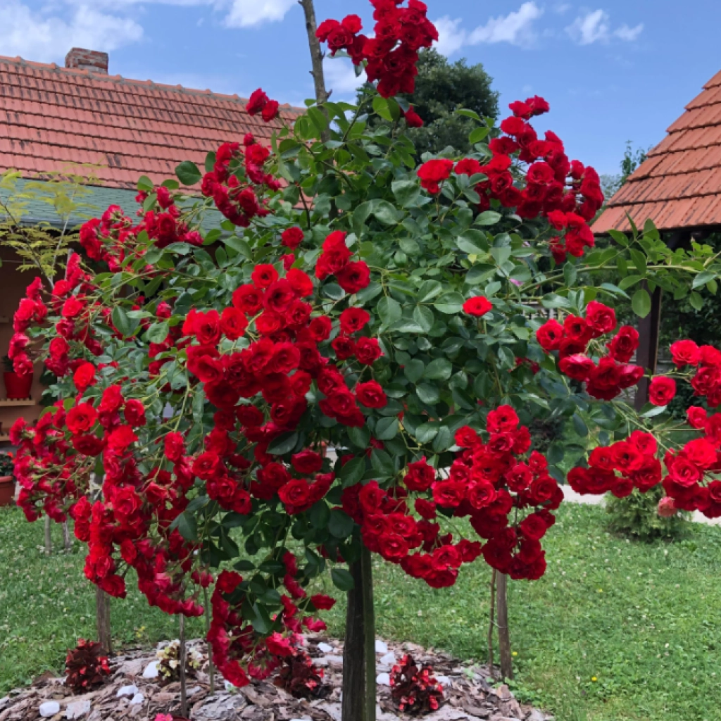 Magastörzsű, csüngő koronájú rózsa, csodálatos, telt, élénk piros színű virágokkal, melyek egész nyáron át pompásan díszítik a kertet vagy a teraszt. Minden rózsa szép, de ez a különleges fajta mesésen mutat virágzáskor, amikor élénk vörös virágai szinte teljesen elárasztják a koronát. A magastörzsre nevelt rózsa stílusos megjelenést kölcsönöz a kertnek. Mivel nem foglal sok helyet, kisebb kertekbe is könnyen beilleszthető. Napos helyre ajánlott helyezni, hogy minél gazdagabban virágozzon.Konténerben nevelt, 2 éves növényeket szállítunk.
