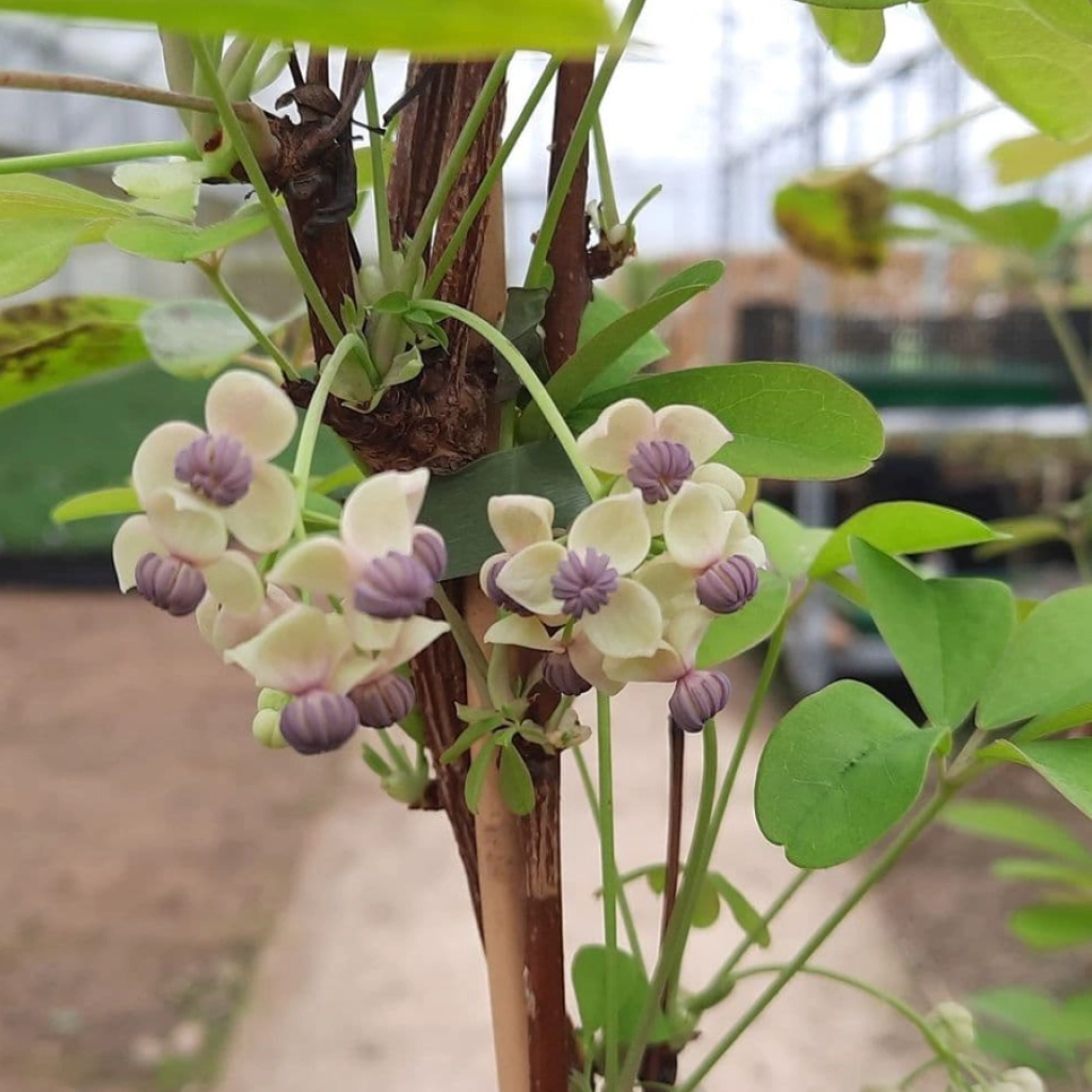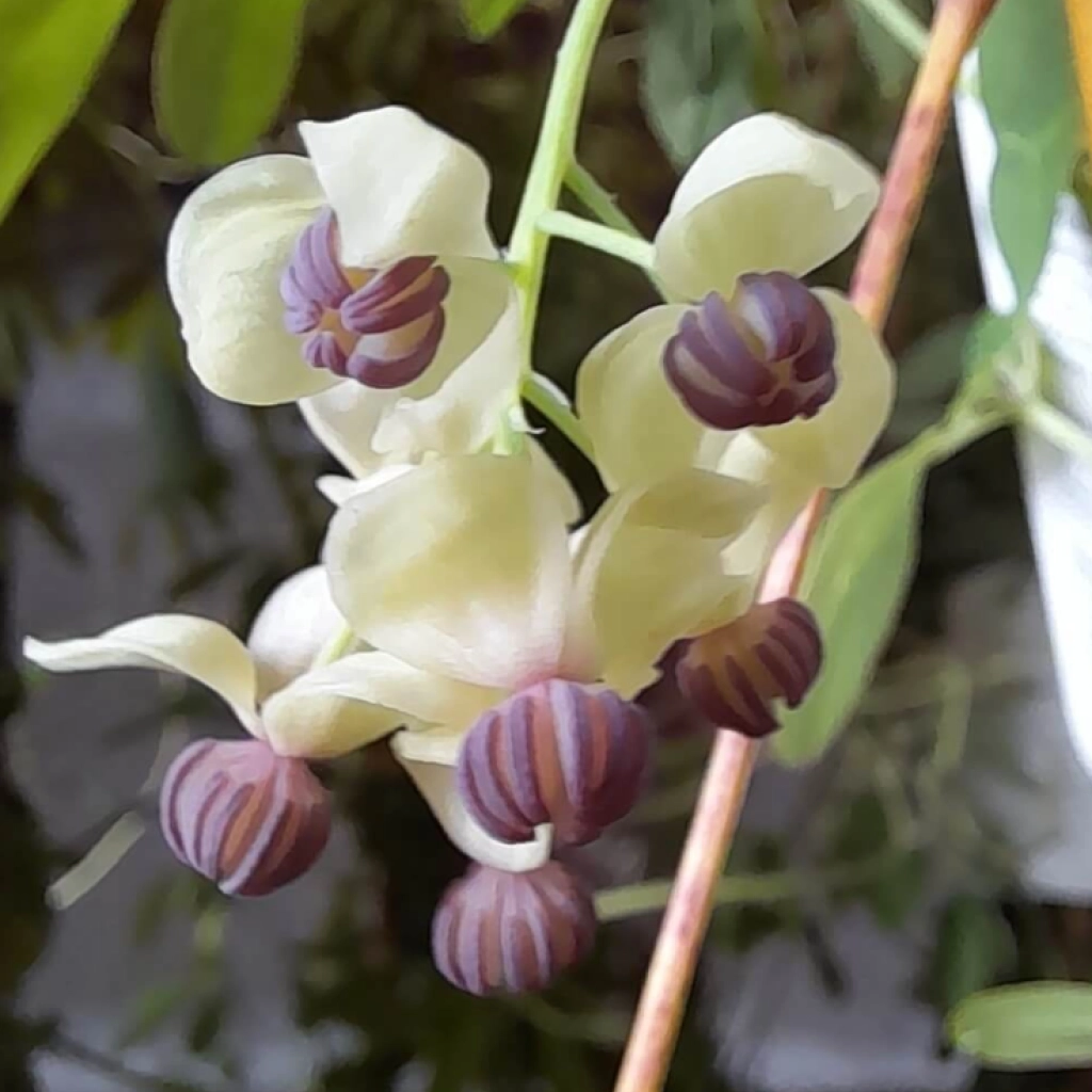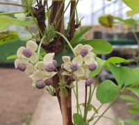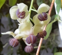 Gyors növekedésű, kevéssé ismert, de igen értékes örökzöld kúszócserje. Levelei egyaránt díszítenek éppúgy, mint krém -fehér és lilás közepű, vanília illatú virágai. Termései igen dekoratívak. Konténeres növényeket szállítunk.