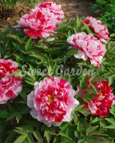 Új, érdekes árnyalatú bazsarózsa fajta. Halvány rózsaszín, sötét rózsaszín és piros színek keveredése. Évelőágyásba vagy szoliterként ültethető. Virágzási időszak: május - június. Konténeres növényeket küldünk.