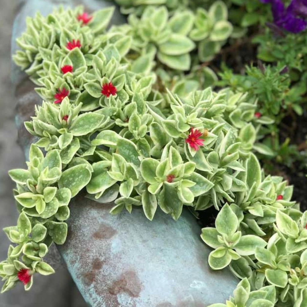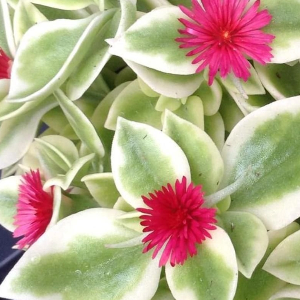 Tarka lombú pozsgás növény élénk színű virágokkal. Kúszó vagy csüngő habitusú. A levelek alapszíne zöld, a szélük krémfehér vagy világos sárga, ami nagyon vonzó megjelenést kölcsönöz a növénynek. A virágok kicsik, pirosasak, formájuk miniatűr margitvirágra hasonlít. A kert napos részein, teraszokon vagy erkélyeken is elhelyezhetjük. Kaspóban és balkonládában is mutatós.