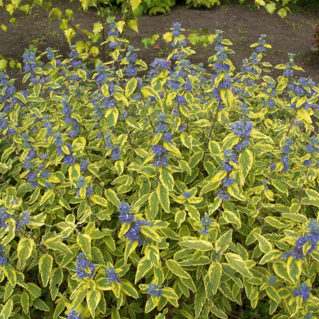 A tarka levelű kékszakáll egy közepes méretű díszcserje, a kifejlett példány 150 cm magasságot érhet el. Lombozata tarka, a levelek közepe zöld, szélei pedig krémsárga színűek. A lombozat egész nyáron át megőrzi üdítően friss színét. Nyár végétől, augusztustól megjelennek a virágok, melyek még vonzóbbá teszik a cserjét. A levélzet zöldje és a kék színű virágok feltűnő kontrasztot alkotnak. Kellemes illatának köszönhetően kertünkbe vonzza a méheket és pillangókat. Jó vízelvezetésű talajt, és napsütéses elhelyezést igényel. Karbantartása egyszerű, a nyári szárazságot és a téli alancsony hőmérsékeletet egyaránt jól viseli.