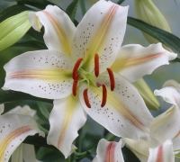 Ár: 2800 Ft - Kód: 31356Ez a liliom vidám és hívogató légkört teremt a kertben. A virágok különleges színvilága egzotikus megjelenést kölcsönöz a növénynek. A virágok fehér szirmokból állnak, amelyeket sárgás-barackos...Jelenleg nem rendelhető