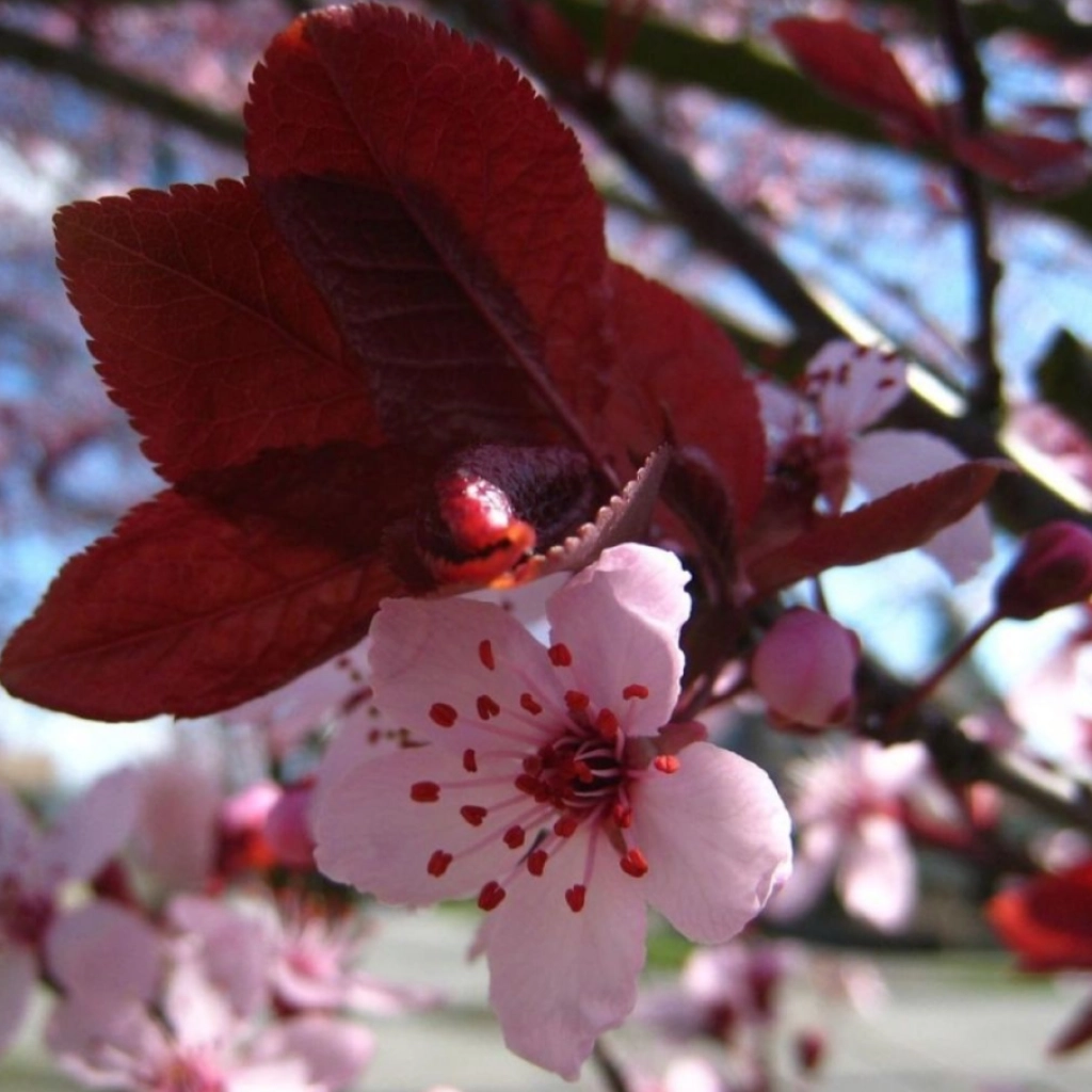 A vöröslevelű díszszilva színei évszakonként változnak. Tavasszal az ágakat halvány rózsaszín virágok borítják, melyek vonzzák a méheket. Az első levelek és hajtások vöröses-bronz árnyalatúak, a nyári hónapokban sötétbíborra váltanak, ősszel pedig vöröses és rozsdás árnyalatok öltenek. A nyár végére érnek be apró termései, amelyek tovább fokozzák a fajta díszítőértékét. A díszszilva sűrű, kerek koronát nevel, és változatos színeivel és textúrájával természetes, mégis elegáns megjelenést ad a kertnek.