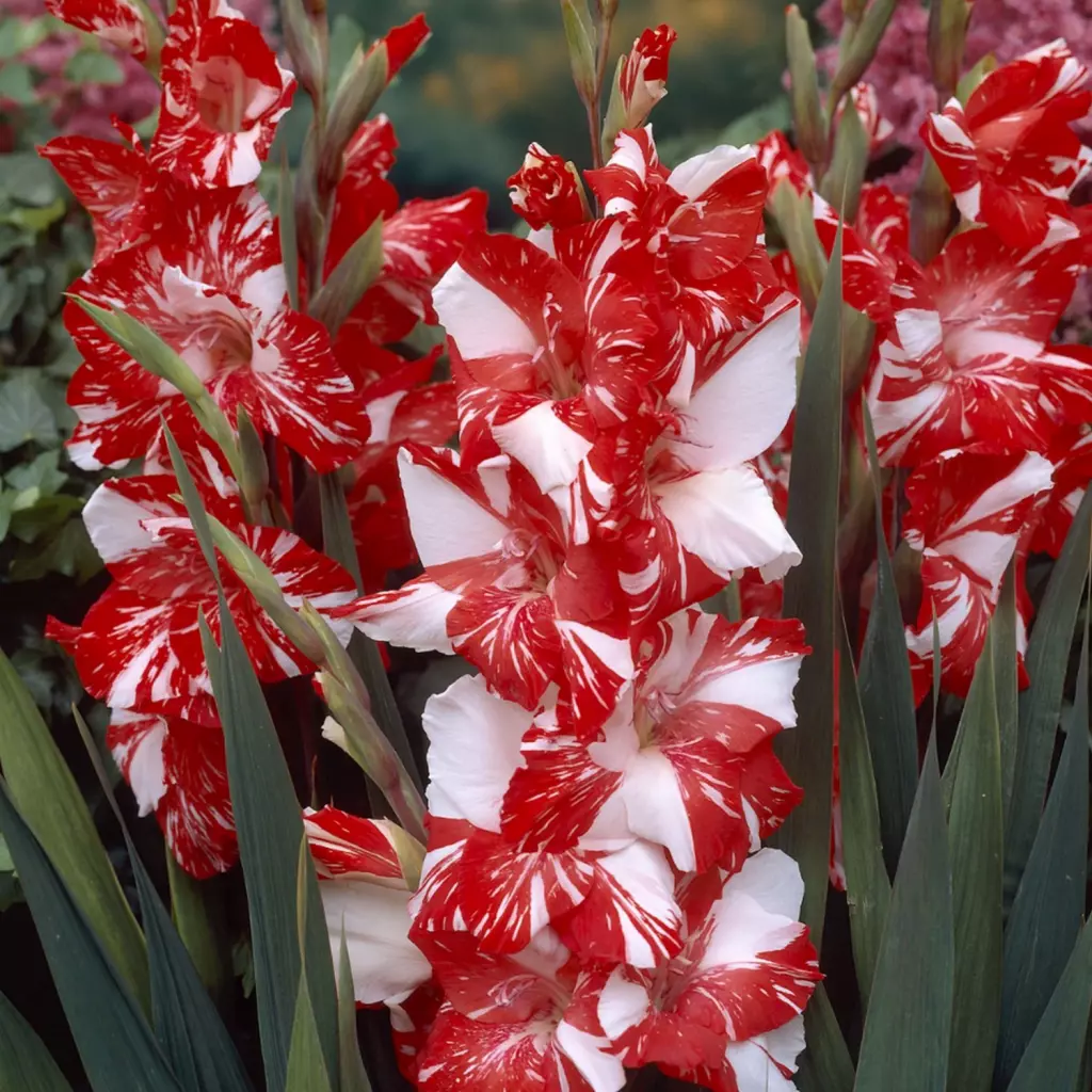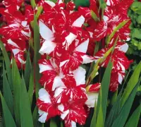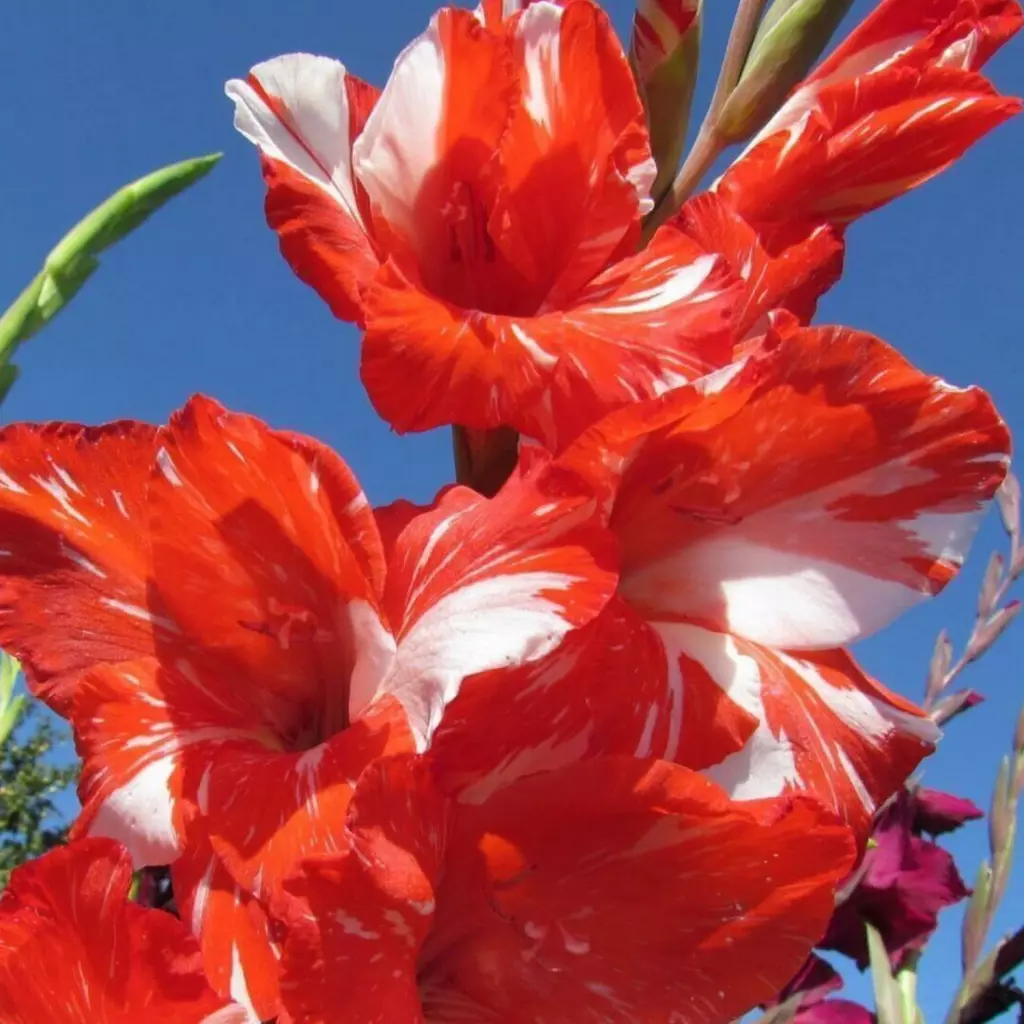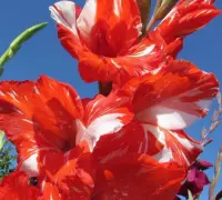 Magával ragadó, kivételes színű kardvirágfajta. A nagy piros-fehér virágok